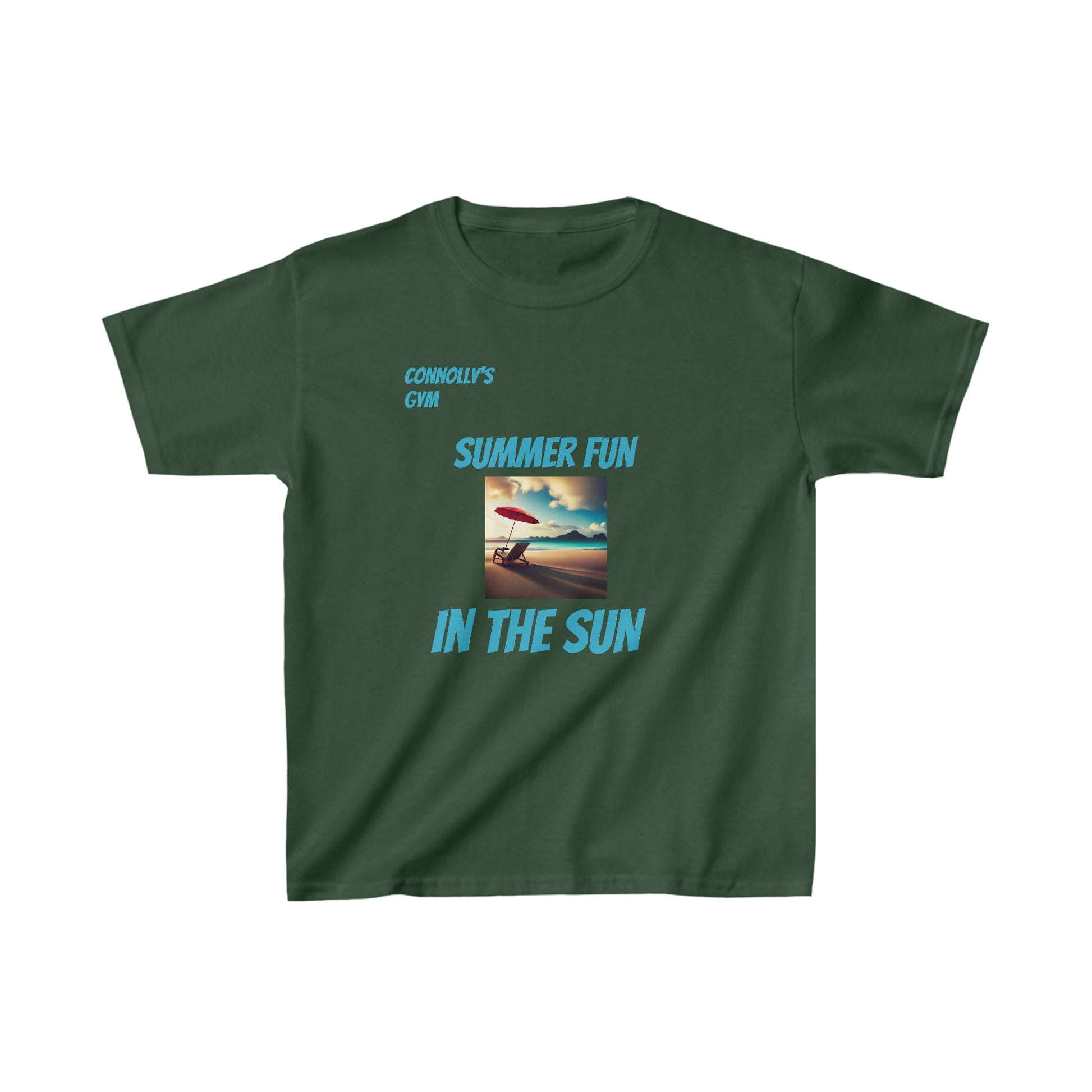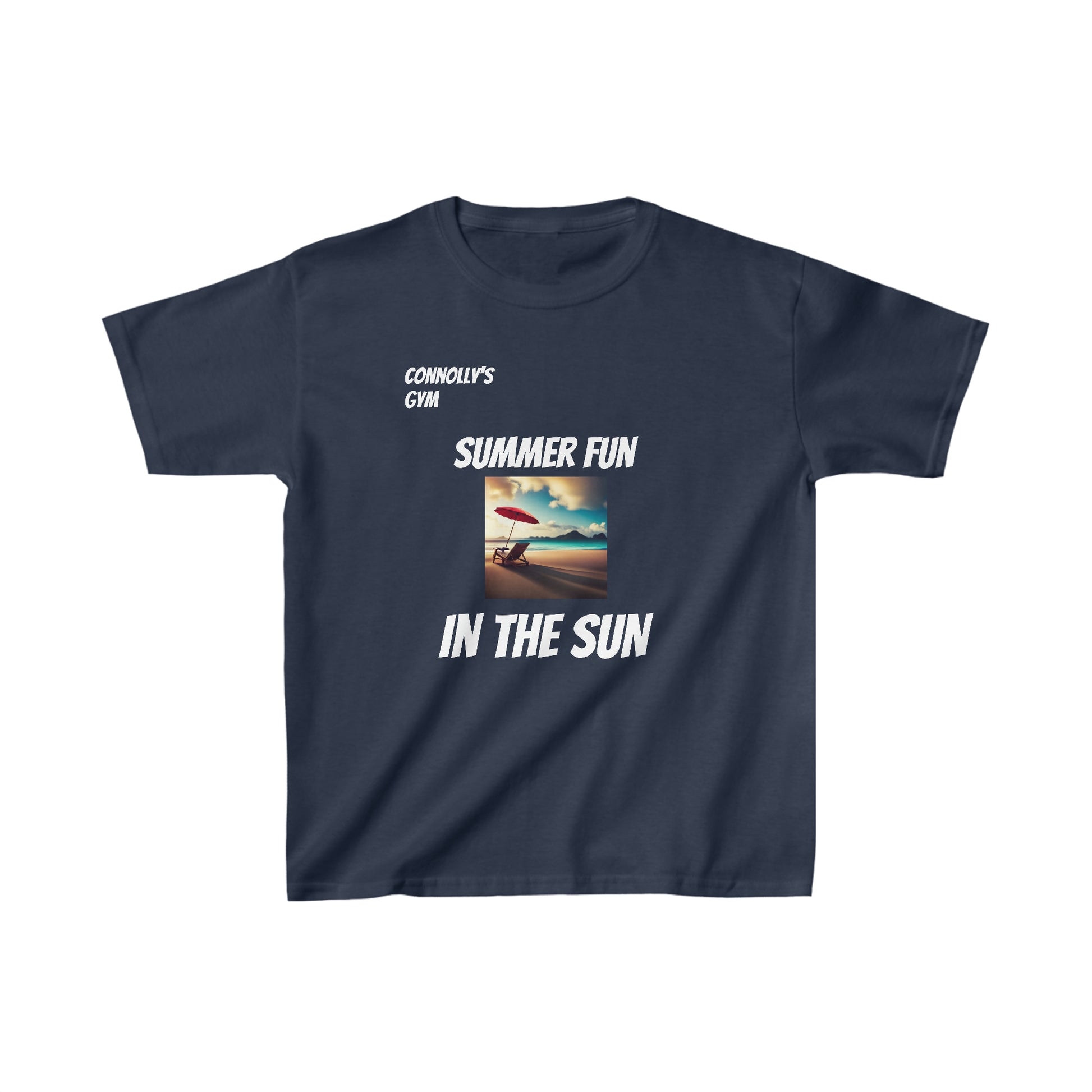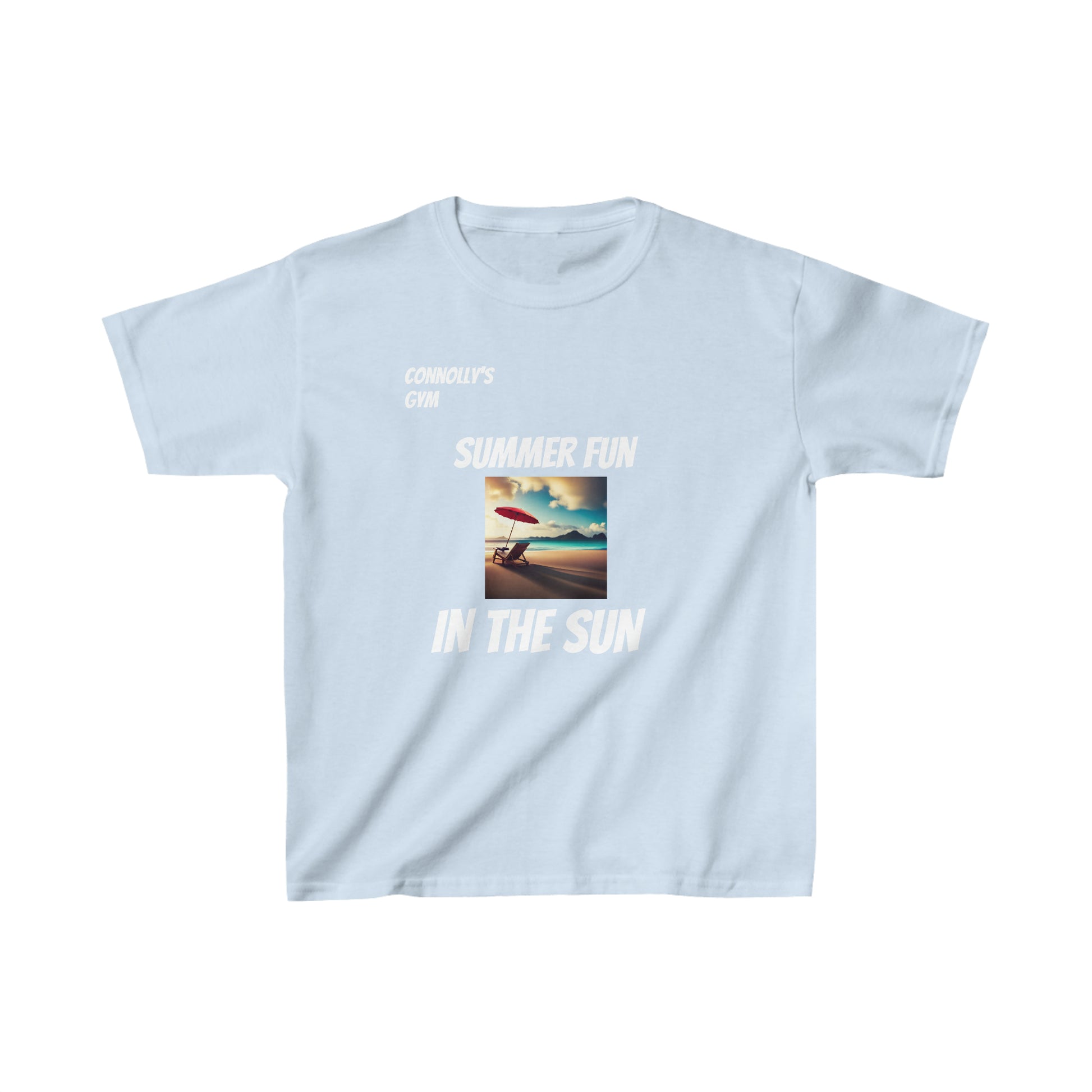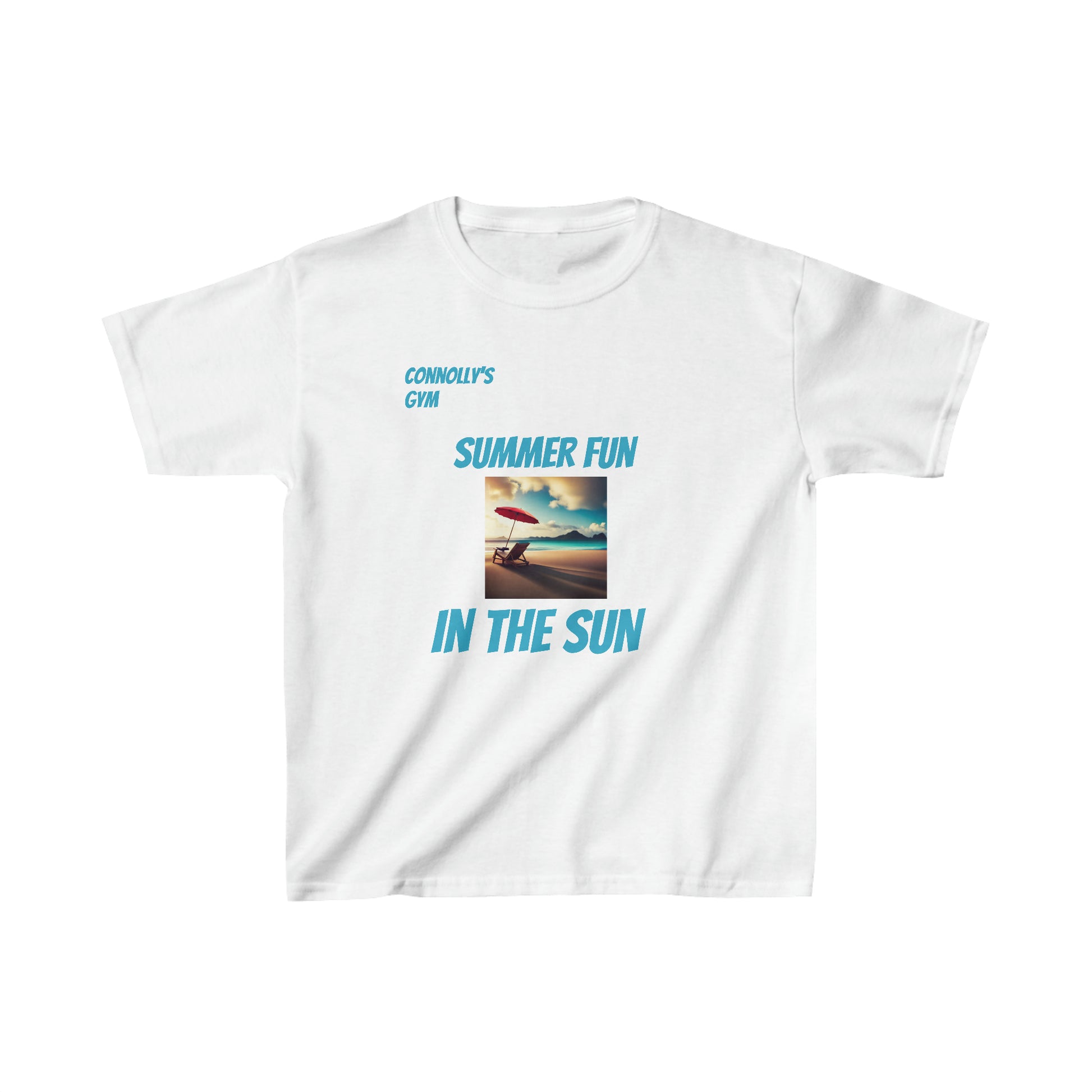 The Connolly's Gym Kids T-Shirt is a vibrant and playful addition to the wardrobe, featuring a tropical beach image that evokes a sense of summer bliss. With the catchy slogan "Summer Fun In The Sun," this T-shirt is perfect for the young ones, capturing the essence of joyful and carefree moments.